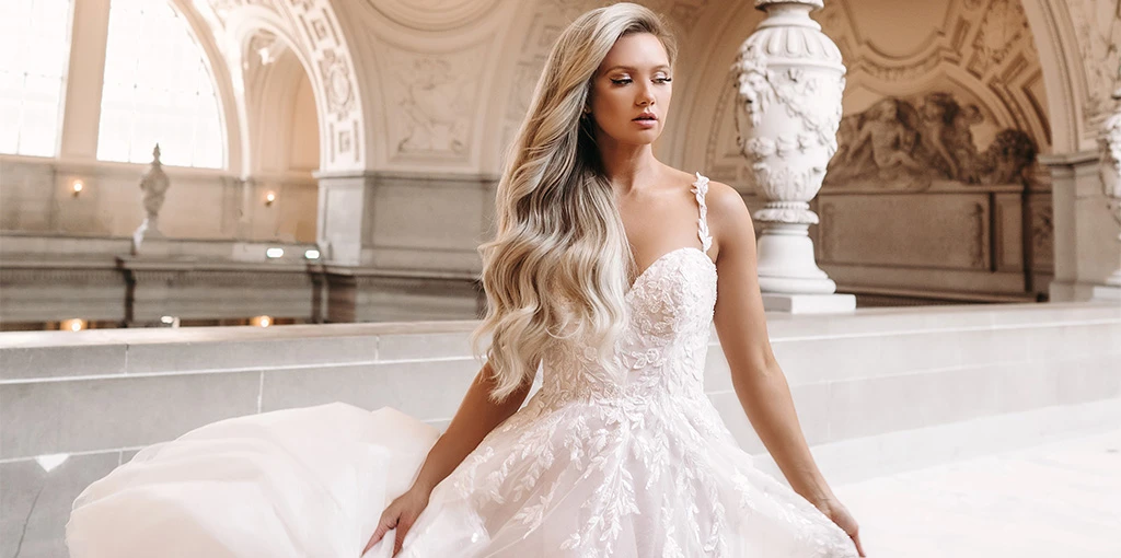 A princess wedding dress is typically characterized as a voluminous A-line or ballgown with many sparkly embellishments, sequins and beading – picture Cinderella! Princess wedding dresses are usually modeled after classic and royal elements, perfect for the bride invoking a fairytale wedding on her big day. What other time do you get the chance to wear a formal ballgown?