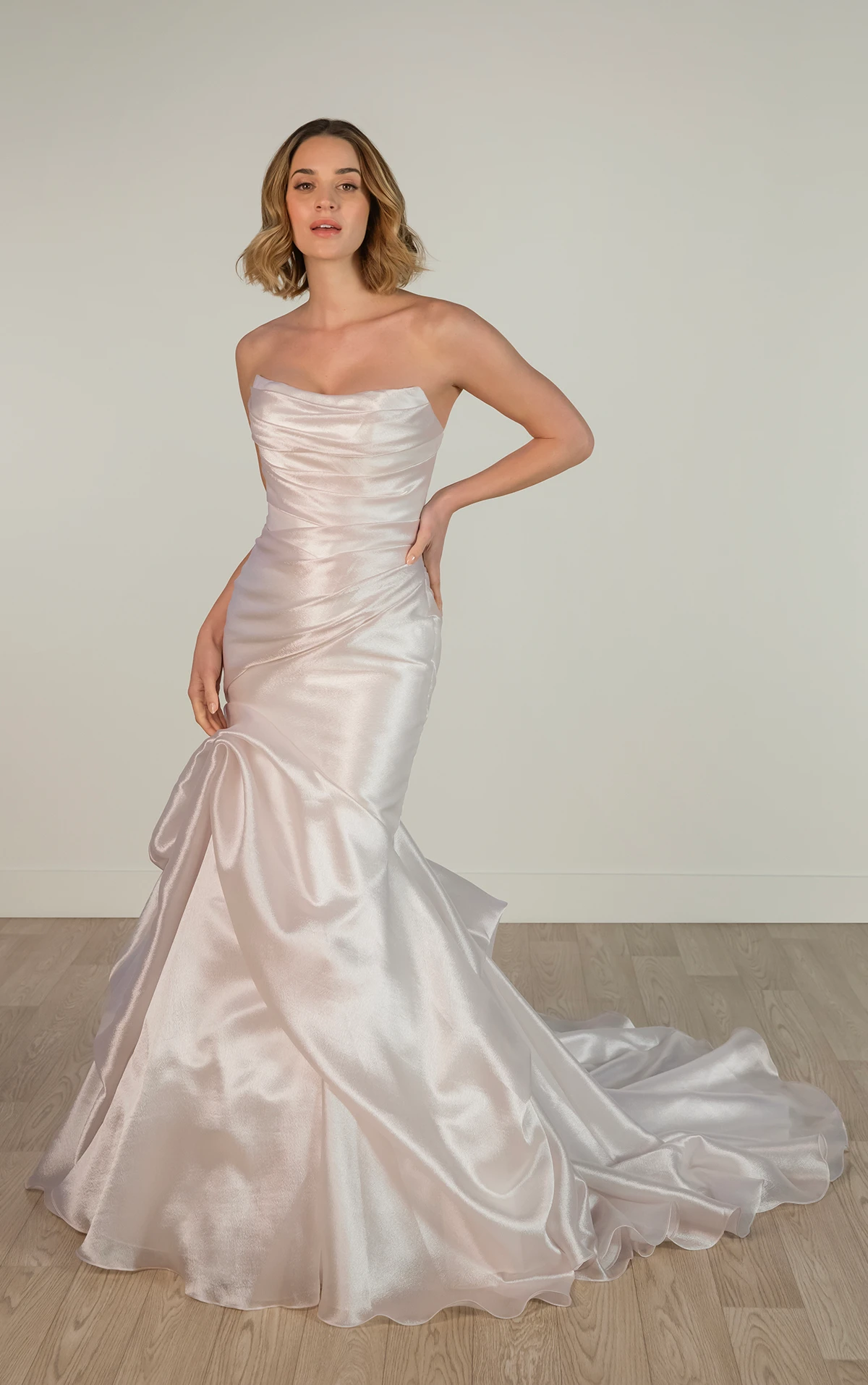 Style SY8123 is a striking showcase of modern sculptural design, ideal for the fashion-forward bride. This bold fit-and-flare wedding gown features a sleek strapless bodice with a softly scooped cat-eye neckline and elegant ruching throughout. A trail of fabric-covered buttons cascades down the back, leading to a voluminous asymmetrical skirt with glamorous pickups that add dynamic movement. Effortlessly blending clean lines with dramatic flair, this head-turning design embodies couture craftsmanship, offering a chic and contemporary bridal look that is both sophisticated and unforgettable. This gown is also available in plus sizes.Â