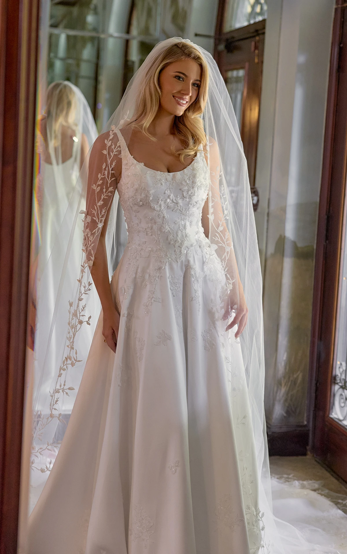 Style D4471 transforms minimal glamour into romantic couture with its sleek satin A-line silhouette adorned in dimensional detail. Wide shoulder straps frame a modern scoop neckline and a flawlessly structutred bodice embellished with 3D floral lace appliquƩs, adding texture and depth to the clean design. In the back, a graceful scoop back highlights a tie-up back that extends into a row of fabric covered buttoms. The flowing skirt sweeps into a chathedral train to complete this contemporary yet romantic wedding dress. Also available in plus sizes.