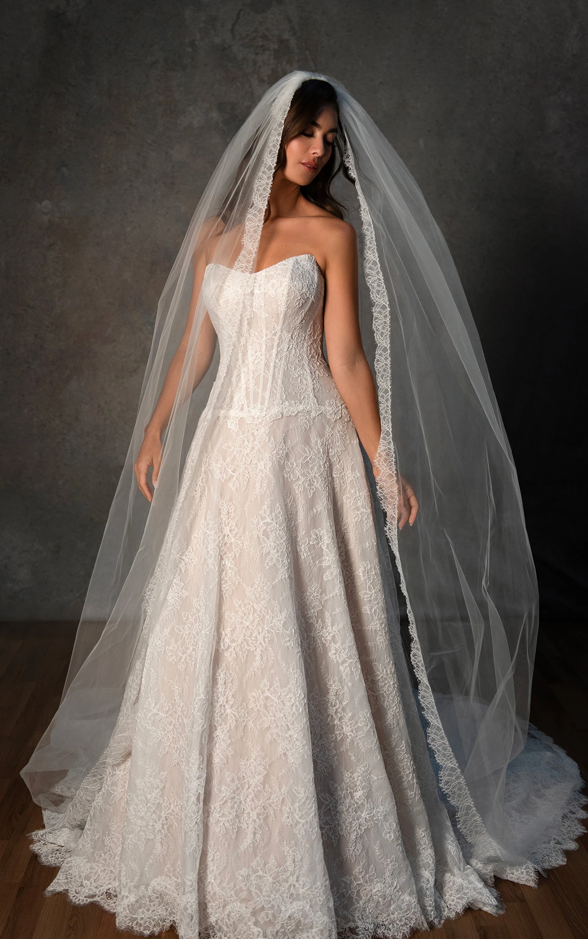 Strapless Chantilly Lace A-Line Gown with Drop Waist and Corset Bodice