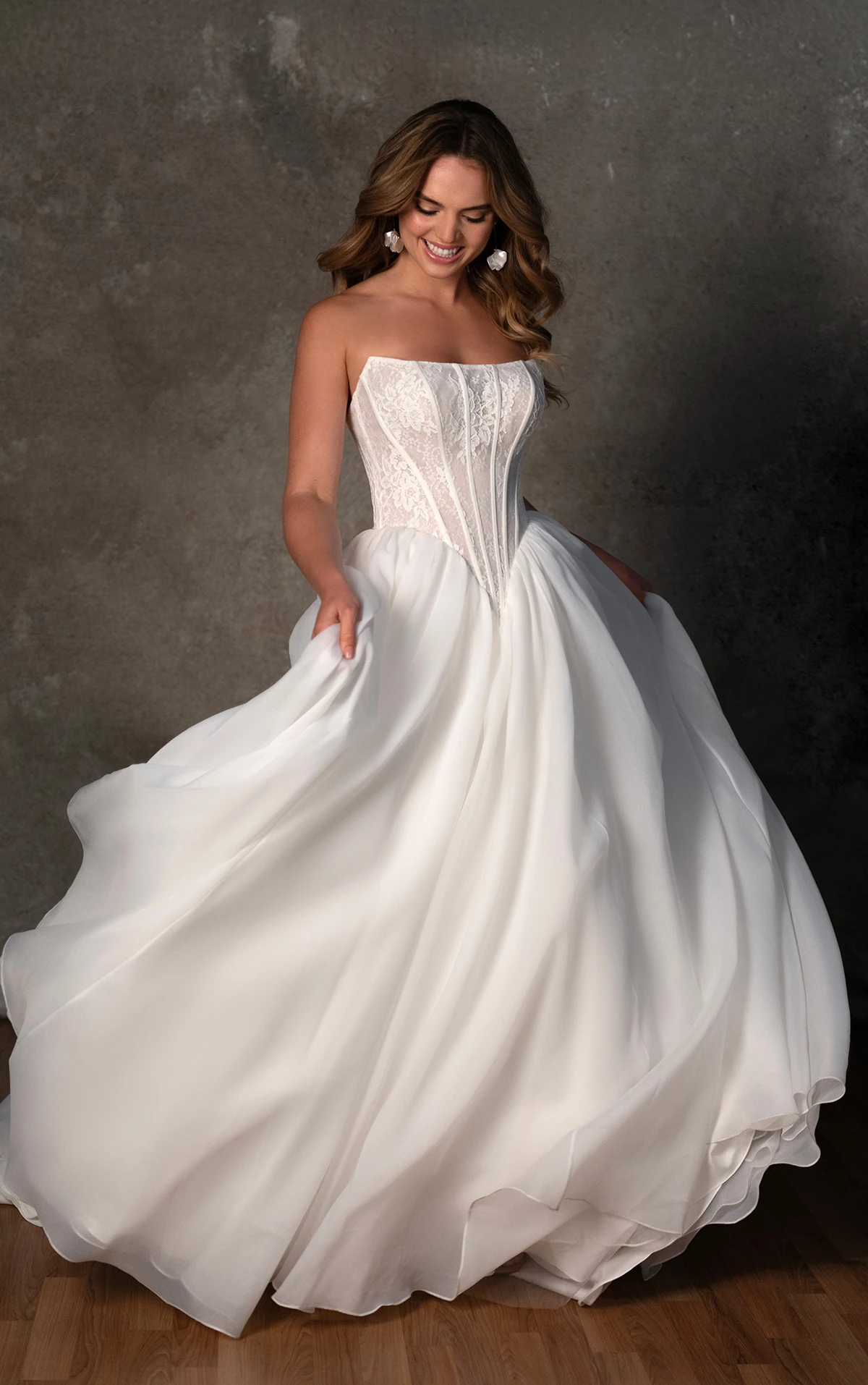 Style D4458 features a striking fusion of modern design and high-fashion details. The strapless sheer lace bodice offers delicate transparency and subtle sparkle, while the extreme basque waist sculpts the figure with bold, architectural lines. Crafted in empress organza fabric, the gathered hip volume of the skirt adds dramatic fullness and movement to the ballgown silhouette. This gown is designed for the bride who desires a memorable statement with refined, fashion-forward elegance. Also available in plus sizes.